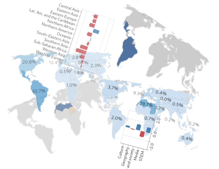 2) Conversely, there is relatively less variation in the proportions of broad topic areas (e.g., media, science, geography, etc.) associated with pageviews, across regions.