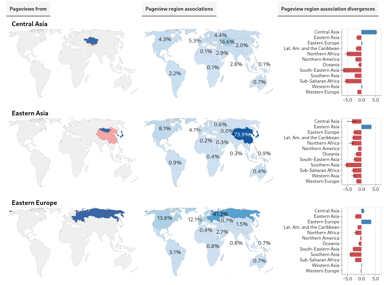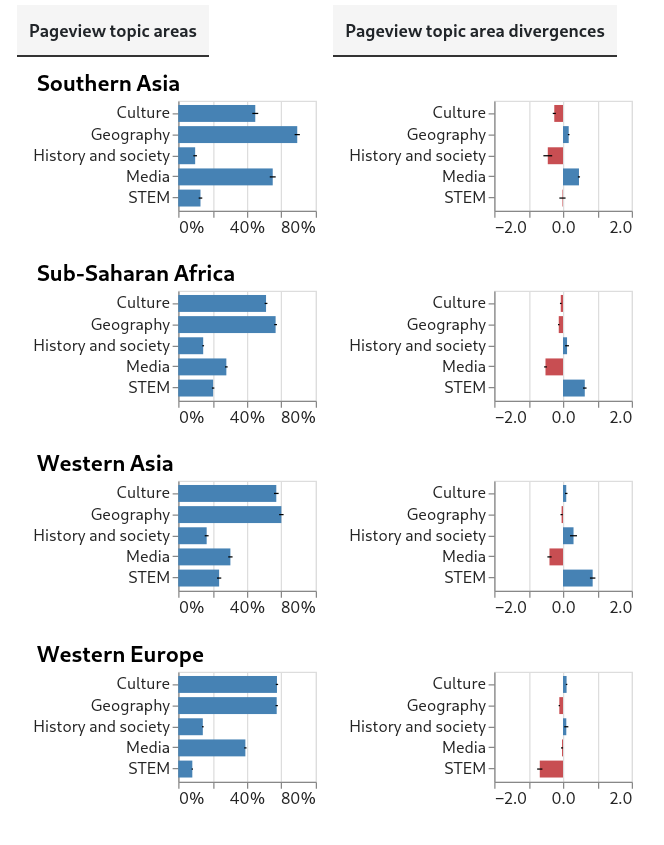 There are two plots for each region. The first shows the estimated proportions of topic area associations for pageviews from the region. The second plot shows the divergences between the region’s estimated proportions and the estimated proportions of the global baseline. As with region associations, topic-area associations for both region and global estimates are weighted averages, and are calculated from the same per-country samples as were used for region associations.