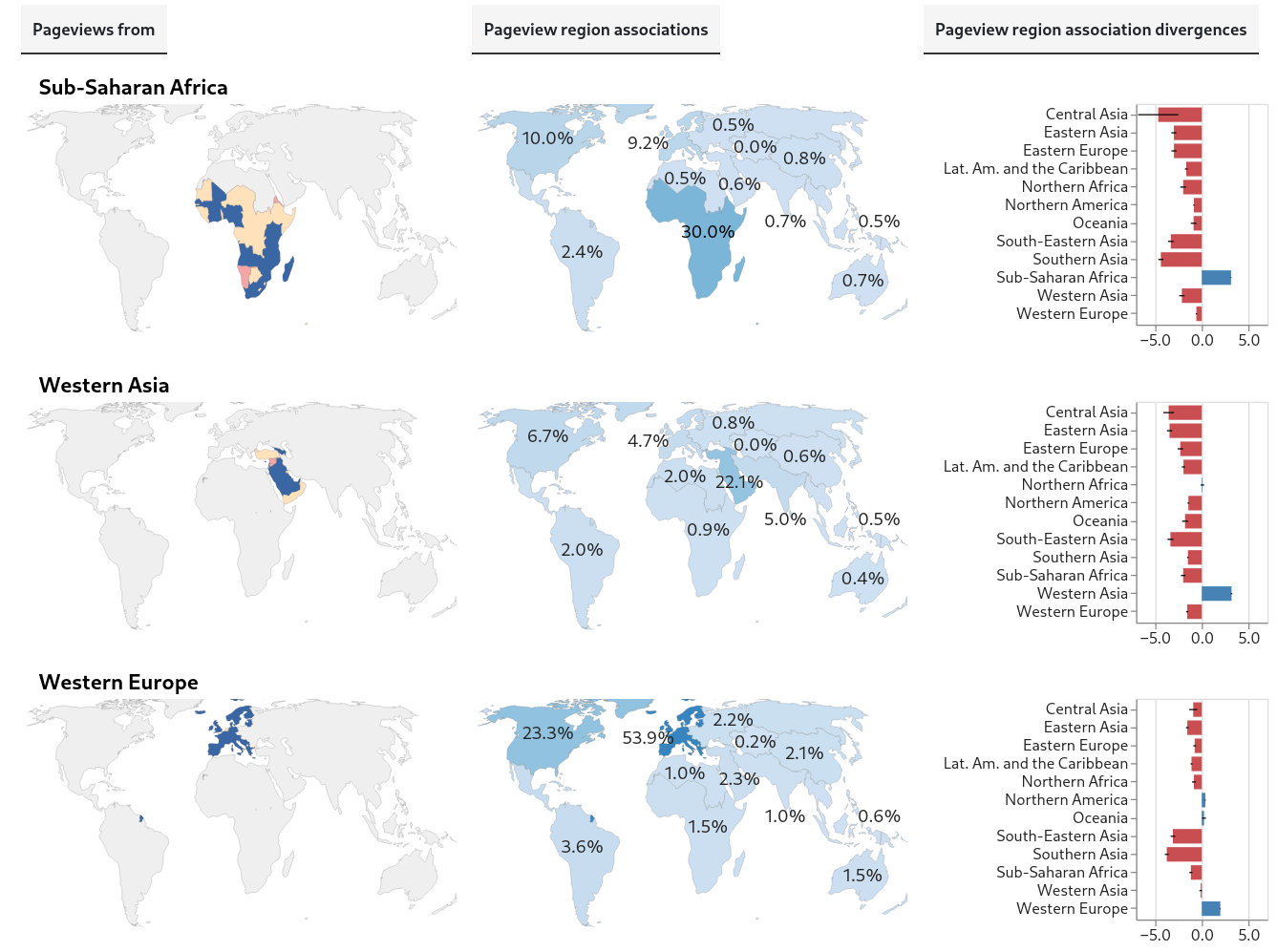 For example, again looking at pageviews from Northern Africa, we see the region has a divergence score of about 4 for Northern Africa (itself), accompanied by negative divergence scores for most other regions. This means that internet population-weighted pageviews from Northern Africa are much more likely to be of articles associated with Northern Africa than are pageviews in general from any region.