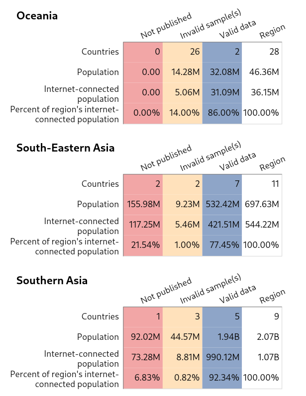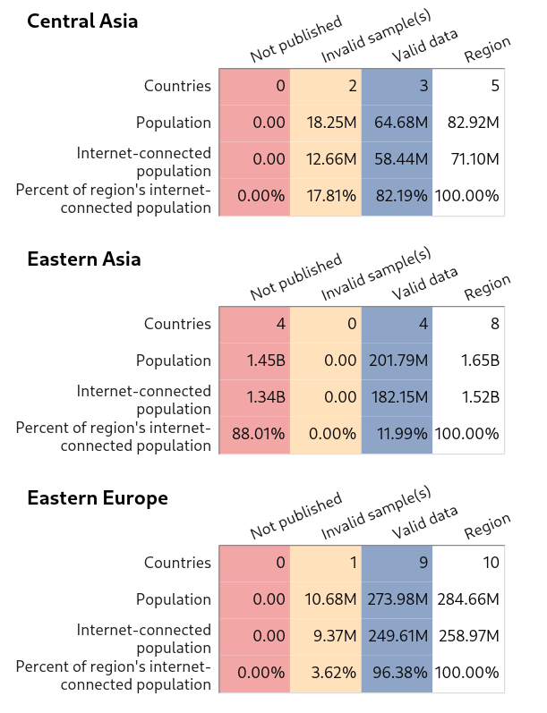 By using countries’ internet-connected populations as weights for calculating contributions to aggregate regional and global estimates, we partly offset the bias from countries that have relatively more pageviews but smaller populations. So, for all aggregations above the country level, estimates are derived from stratified samples, and the global internet-connected population (or, specifically, the internet-connected population of all the countries for which we have valid samples) is the human population we can potentially make inferences about most directly.
