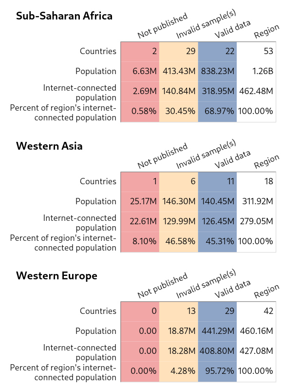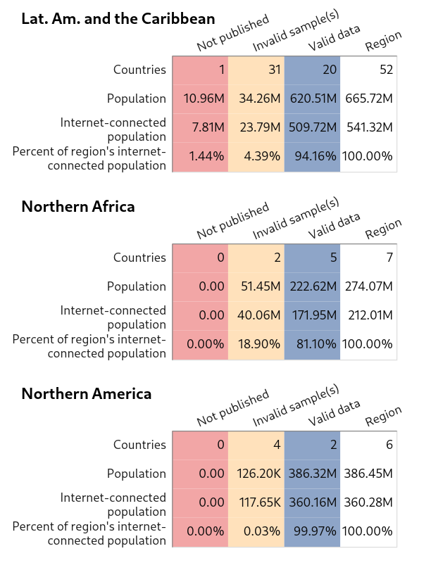 The last plots I’ll share provide an overview of data coverage for each region in terms of demographics, including aggregate internet-connected population estimates, which is the measure used for weights. The plots are mostly self-explanatory. The first three columns refer to the same sample statuses mentioned above (valid data, data omitted from the Differential Privacy dataset, and inadequate samples). The last column shows totals for the region.