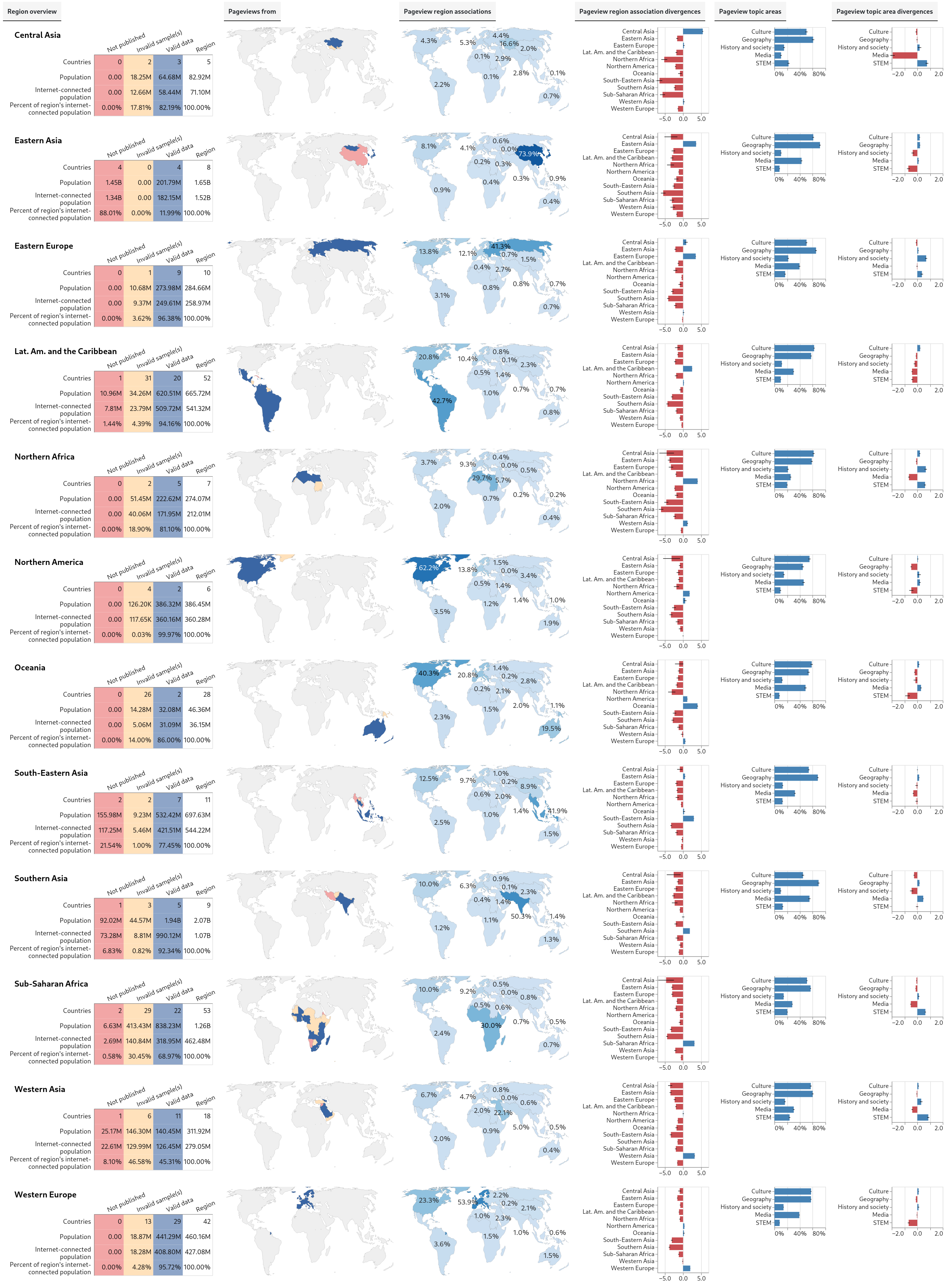 These charts show the first of the initial results described above. Each group of three charts (two maps and a bar chart) is about pageviews from a different global region.